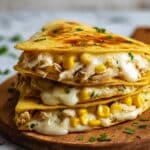 The image shows two stacked corn tortillas that are golden brown and lightly crispy on the outside. Each tortilla holds a thick layer of melted white cheese mixed with shredded chicken, bright yellow corn kernels, and green herbs. The melted cheese looks creamy and gooey, oozing slightly from the sides. The tortillas are placed on a round wooden serving board against a white marbled surface with some green herb garnishes sprinkled on top. Photo taken with an iphone --ar 4:5 --v 7