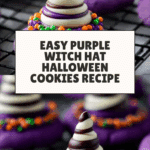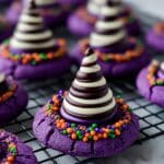 Celebrate Halloween with these delightful Best Witch Hat Halloween Cookies. These festive cookies feature a soft, peanut butter-infused base tinted with purple gel food coloring, coated in spooky sprinkles, and topped with classic chocolate kisses to resemble witch hats. Perfect for parties and trick-or-treaters, these cookies are as fun to make as they are to eat.