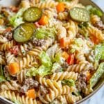 Keywords: Big Mac pasta salad, creamy pasta salad, chickpea pasta salad, ground beef salad, potluck recipe, barbecue side dish, healthy pasta salad
