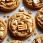 The image shows several round cookies with a golden brown color placed closely together on a white marbled surface. Each cookie has a soft and chewy texture with visible creams and chunks on the top, including small white marshmallow pieces and a rectangular biscuit piece embedded in the center. The cookies have slightly darker edges and a rough crumbly surface, creating a warm and inviting look. photo taken with an iphone --ar 4:5 --v 7