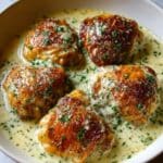 Bobby Flay’s Chicken Thighs with Creamy Garlic Sauce is a rich and flavorful dish featuring bone-in, skin-on chicken thighs seared to golden perfection and simmered in a luscious garlic cream sauce. This recipe balances savory garlic, tangy Dijon mustard, and fresh lemon juice to create a comforting yet elegant meal perfect for dinner.
