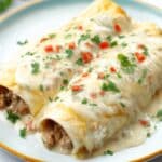 Delicious and hearty Breakfast Enchiladas featuring sausage, scrambled eggs, and cheese wrapped in warm flour tortillas, topped with a creamy mushroom sauce and melted cheddar. Perfect for a satisfying morning meal with optional fresh toppings to enhance the flavor.