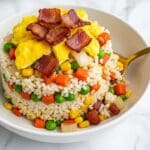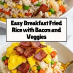 This flavorful Breakfast Fried Rice recipe combines crispy bacon, scrambled eggs, and vibrant vegetables with cold cooked rice, all stir-fried and seasoned with soy sauce and toasted sesame oil for a satisfying morning meal.