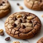 The image shows a round chocolate cookie with a cracked surface and a soft texture. The cookie has layers of dark and light brown shades, with small chocolate chips embedded on top and some walnut pieces scattered around it. The cookie is placed on a white marbled surface with a few coffee beans nearby, adding contrast to the warm colors of the cookie. In the background, more cookies are slightly out of focus, showing a cozy and inviting setting. Photo taken with an iphone --ar 4:5 --v 7