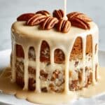 The image shows a tall, round cake with three visible layers. Each layer is filled with pieces of nuts and cake chunks, with a light brown creamy sauce dripping down the sides. The top layer is fully covered with a thick, smooth glaze of the same sauce, and several whole pecans are placed neatly on top. The cake sits on a white plate, which contrasts with the white marbled background. The creamy sauce looks glossy and rich, making the cake appear moist and delicious. Photo taken with an iphone --ar 4:5 --v 7