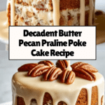 This Butter Pecan Praline Poke Cake is a luscious dessert featuring a moist yellow cake infused with a rich praline sauce made from sweetened condensed milk, butter, and brown sugar. Topped with whipped cream and crunchy pecans, it offers a delightful combination of creamy, nutty, and sweet flavors perfect for any occasion.