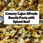 This Cajun Cream Cheese Alfredo Bowties with Spiced Ground Beef is a creamy, flavorful pasta dish that blends the richness of cream cheese and Parmesan with the smoky, spicy notes of Cajun seasoning. Bowtie pasta is perfectly coated in a luscious Alfredo sauce, combined with savory, spiced ground beef, making it a hearty and satisfying meal ideal for weeknight dinners or casual entertaining.