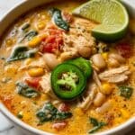 This Cajun White Chicken Chili is a creamy, mildly spicy soup that combines shredded chicken, white beans, and a flavorful blend of Cajun seasoning. Perfect for a comforting meal, it features a rich texture from cream cheese and heavy cream, balanced with a hint of lime and fresh cilantro for brightness.