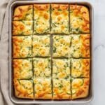 The dish is a rectangular baked cheesy bread cut into ten rectangular pieces arranged neatly in a metal tray. Each piece has a top layer of melted golden and white cheese with small browned spots and scattered green herbs sprinkled all over. The cheese looks soft and gooey with a slightly crispy surface. Underneath the cheese layer, patches of green pesto or sauce peek through, adding a fresh color contrast. The edges of the bread are slightly browned and crispy, while the inside looks fluffy. The metal tray rests on a white marbled surface with a light beige cloth partially visible to the left. photo taken with an iphone --ar 4:5 --v 7