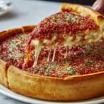 This classic Chicago-Style Deep Dish Pizza boasts a buttery, golden crust loaded with gooey mozzarella cheese, rich tomato sauce, and savory Italian sausage or pepperoni. Perfectly baked to a thick, hearty finish, this pizza recipe is ideal for anyone craving a slice of authentic Chicago comfort food.