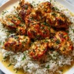 Chicken Scampi with Creamy Garlic Parmesan Rice is a flavorful, comforting one-pan meal that combines tender, seared chicken with a rich and creamy garlic parmesan rice. The dish is infused with garlic, butter, parmesan cheese, and a hint of red pepper flakes and lemon juice, bringing a perfect balance of savory and zesty flavors.