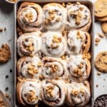 Indulge in these chocolate chip cookie rolls, a delightful fusion of cinnamon roll dough filled with rich chocolate chip cookie dough. Baked to golden perfection and topped with a creamy vanilla bean glaze, these rolls offer gooey chocolate goodness in every bite, perfect for a special breakfast or dessert treat.