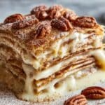 The image shows a close-up of a multi-layered dessert with about five layers, each thin and light golden brown. Between each layer is a creamy white filling that looks smooth and slightly melted, flowing gently over the edges. The top layer is generously dusted with cinnamon powder and small pieces of pecans, adding a rough and crunchy texture. The dessert sits on a white plate with soft shadows, all set on a white marbled surface. The lighting highlights the creamy texture and warm colors, making the dish look rich and inviting. photo taken with an iphone --ar 4:5 --v 7