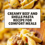 Keywords: Creamy beef pasta, shell pasta recipe, beef and marinara, comfort food pasta, creamy cheddar beef shells