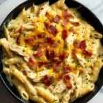 Savor a rich and comforting meal with this Creamy Crack Chicken Penne. Tender chicken breasts seasoned with ranch, crispy bacon, and creamy cheeses come together in a flavorful sauce that perfectly coats al dente penne pasta. This skillet dish is quick to prepare and makes a delicious weeknight dinner that’s sure to please the whole family.
