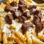 This Creamy Ranch Steak & Mozzarella Garlic Butter Pasta combines tender seared steak bites with al dente penne pasta enveloped in a rich, creamy ranch-infused mozzarella garlic butter sauce. Perfect for a comforting dinner, this dish offers a delightful blend of savory flavors and creamy textures that come together effortlessly in one skillet.