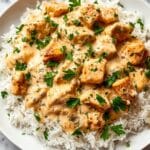 - Serve: Plate the cooked rice onto serving dishes, then top with the smothered chicken and creamy sauce. Garnish with freshly chopped parsley and serve immediately while warm.