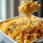 This Crispy Baked Mac & Cheese recipe combines creamy, cheesy pasta with a perfectly golden, crunchy breadcrumb topping. Cooked elbow macaroni is enveloped in a smooth cheese sauce made from sharp cheddar, Gruyère, and mozzarella cheeses, then baked until bubbly and crispy. Ideal as a comforting main dish or side, it offers rich flavors and a delightful texture contrast.