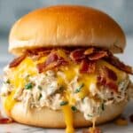 - Serve: Spoon the creamy shredded chicken onto sandwich buns and serve hot. Optionally, garnish with extra green onions or cheddar cheese for added flavor.