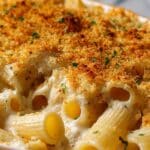 Close-up of baked rigatoni pasta layered thickly with creamy white cheese sauce, topped with a golden brown crispy breadcrumb layer scattered evenly over the surface, with small green herb pieces sprinkled throughout for color contrast. The pasta tubes are visible through the sauce, showing ridged texture and a soft, baked appearance. The dish is in a white marbled textured setting. photo taken with an iphone --ar 4:5 --v 7