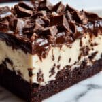 Earthquake Cake is a decadent layered chocolate dessert featuring a rich chocolate cake base topped with a creamy swirl of sweetened cream cheese, crunchy nuts, shredded coconut, and melted chocolate chips. This indulgent cake combines smooth, nutty, and chocolaty textures in every bite, perfect for celebrations or a special treat.