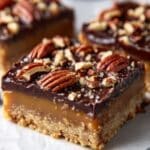 Easy Turtle Bars are a deliciously indulgent dessert featuring a buttery crust topped with pecans, a rich caramel layer, and melted milk chocolate chips. Finished with extra pecans, sea salt flakes, and a drizzle of caramel sauce, these bars offer a perfect balance of sweet and salty flavors with a satisfyingly chewy texture.