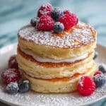A stack of three fluffy, golden-brown pancakes sits on a white plate, each pancake separated by a thin layer of white cream. The top pancake is dusted with a light sprinkle of powdered sugar and decorated with fresh red raspberries and dark blue blueberries. A few extra raspberries and a light dusting of powdered sugar are scattered around the plate, all set against a soft white marbled background. photo taken with an iphone --ar 4:5 --v 7