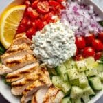 - Assemble the Bowls: In serving bowls, layer cooked rice or quinoa, shredded romaine lettuce, grape tomatoes, cucumber, red onion, sliced chicken, and sprinkle feta cheese on top. Finish with a generous dollop of tzatziki sauce.