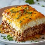 A hearty and comforting Ground Beef Casserole combining tender ground beef, savory tomato sauce, and creamy cheeses baked to perfection. This dish features layered flavors of garlic, Italian seasoning, and a creamy sour cream sauce, all mixed with pasta and topped with melted cheddar and mozzarella. Perfect for a satisfying family dinner.