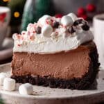 A slice of rich chocolate cheesecake is shown on a white speckled plate, sitting on a wooden table with small white marshmallows scattered around. The cheesecake has three visible layers: a dark brown crumbly chocolate crust at the bottom, a dense and smooth medium brown chocolate filling in the middle, and a thick fluffy white whipped cream topping. On top of the whipped cream are mini marshmallows, small dark chocolate chips, and bits of crushed red and white peppermint candy, adding texture and color contrast. The background shows blurred festive decorations and greenery on a white marbled texture. photo taken with an iphone --ar 4:5 --v 7
