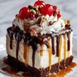 This Hot Fudge Sundae Brownie Cheesecake is a decadent dessert combining a rich, fudgy brownie base with a creamy cheesecake layer. Topped with warm hot fudge sauce, whipped cream, nuts, cherries, and sprinkles, it delivers a delightful sundae experience baked into a single indulgent treat.