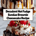 The Hot Fudge Sundae Brownie Cheesecake is a decadent dessert that combines the rich flavors of fudgy brownies, creamy cheesecake, and warm hot fudge sauce. Topped with whipped cream, nuts, cherries, and sprinkles, it’s a crowd-pleaser perfect for special occasions or indulgent treats.