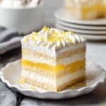 - Assemble Tiramisu: Quickly dip each lady finger into the cooled lemon syrup, making sure they absorb liquid but don’t become soggy. Arrange a single layer of dipped lady fingers in the bottom of an 8×8 inch or similar sized pan. Spread half of the whipped mascarpone mixture evenly over the lady fingers. Spoon and gently spread the lemon curd over the mascarpone layer. Repeat with another layer of dipped lady fingers. Finish by smoothing or piping the remaining whipped mascarpone on top. Garnish with grated white chocolate or lemon zest and slices if desired.