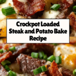 This Loaded Steak and Potato Bake is a hearty, comforting dish perfect for slow cooking. Tender cubed beef steak and diced potatoes are layered with crispy bacon bits and melted cheddar cheese, then slowly cooked with a creamy garlic sour cream mixture. Finished with fresh green onions, this slow cooker recipe is easy to prepare and delivers rich, comforting flavors perfect for a satisfying meal.