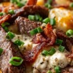 This Loaded Steak and Potato Bake is a hearty, comforting dish perfect for slow cooking. Tender cubed beef steak and diced potatoes are layered with crispy bacon bits and melted cheddar cheese, then slowly cooked with a creamy garlic sour cream mixture. Finished with fresh green onions, this slow cooker recipe is easy to prepare and delivers rich, comforting flavors perfect for a satisfying meal.
