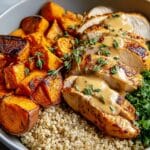 - Assemble Bowls: Slice the cooked chicken breasts. Assemble bowls by layering quinoa or rice, roasted sweet potatoes, sliced chicken, and garnish generously with fresh herbs.