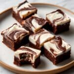 A round white plate holds six square pieces of chocolate fudge with a creamy white swirl on top. Each piece shows a dark brown chocolate layer mixed with smooth white swirls, giving a marbled effect on the surface. The fudge looks rich and dense with some pieces showing a bite taken out, revealing their soft inside. The plate rests on a white marbled texture. photo taken with an iphone --ar 4:5 --v 7