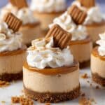 Mini Biscoff Cheesecakes are a delightful no-bake treat featuring a crunchy Biscoff cookie crumb crust, a creamy Biscoff-flavored cheesecake filling, topped with whipped cream, melted Biscoff spread, extra cookie crumbs, and a half Biscoff cookie. These individual cheesecakes are perfect for fans of the beloved cookie butter and offer a rich, indulgent dessert that requires no baking and only refrigeration to set.