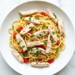 A white plate holds a dish of spaghetti mixed with shredded chicken pieces. The pasta is coated lightly with oil and has small bits of red tomato and green parsley scattered throughout. The shredded chicken is pale with a slightly browned texture, sitting evenly on top and throughout the pasta. The herbs add small pops of bright green color, while the pasta strands are golden yellow and glossy. The plate is placed on a white marbled surface. photo taken with an iphone --ar 4:5 --v 7