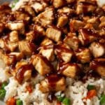 A close-up image of a white plate filled with white fried rice mixed with small pieces of carrots and green peas as the bottom layer, topped with golden-brown grilled chicken chunks glazed with a shiny, dark brown sauce, evenly spread across the top. The rice has a fluffy texture with visible grains, while the chicken looks juicy and slightly crispy on the edges. The background is a white marbled surface. photo taken with an iphone --ar 4:5 --v 7