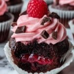 Delight in these Raspberry Chocolate Lava Cupcakes, featuring moist chocolate cupcakes with a molten raspberry center, topped with luscious raspberry buttercream and garnished with fresh raspberries and dark chocolate shavings. A perfect treat that combines rich chocolate and fruity tartness for an indulgent dessert experience.