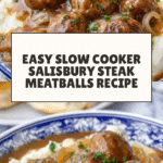 Salisbury Steak Meatballs combine the delicious flavors of Salisbury steak with the convenience of frozen meatballs, slow-cooked in a savory beef mushroom gravy. This comforting dish delivers tender beef meatballs smothered in a rich, thickened sauce made from beef broth, beefy mushroom soup, and steak sauce, perfect for serving over mashed potatoes or egg noodles for a hearty family meal.