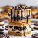 Slutty Cheesecake Bars are a decadent dessert featuring a rich chocolate chip cookie base, a layer of Oreos, and a creamy cheesecake topping. Perfect for gatherings or indulgent treats, these bars combine classic flavors in a delightfully easy-to-make bar.