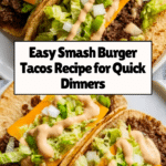 Smash Burger Tacos combine the best of two favorites: juicy, crispy-edged smashed beef patties served in soft flour tortillas. This recipe creates a flavorful, cheesy taco experience with classic toppings like shredded lettuce, diced onions, and dill pickle chips, perfect for a quick and satisfying dinner.