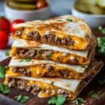 - Slice and serve: Remove the quesadillas from the skillet, slice into wedges, and serve hot with optional burger toppings like pickles, diced onions, and burger sauce or your favorite dipping sauces.