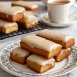 A white plate with intricate dark patterns holds six rectangular glazed brown cake bars, each with a smooth, light beige icing layer on top. The cake bars are thick and soft-looking, with the icing evenly covering the surface, slightly shiny. In the background, there is a white marbled texture surface with more cake bars on a black wire rack, a white cup filled with a warm drink, and part of a white teapot visible. The overall scene shows a cozy setting with warm brown and cream tones. Photo taken with an iphone --ar 4:5 --v 7