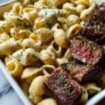 Steak Bites and Shell Pasta in Garlic Butter Alfredo Sauce Recipe