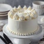 A round white cake with smooth white frosting covers the entire surface. The top is decorated with a swirl pattern in the center made from piped white cream, surrounded by eight tall white cream rosettes, each topped with small white sprinkles. Around the base of the cake is a line of small white cream dots. The cake sits on a white pedestal cake stand on a white marbled surface dusted with powdered sugar. Two black knives are placed nearby on the surface. In the blurred background, a white bowl and a stack of white plates are visible. photo taken with an iphone --ar 4:5 --v 7